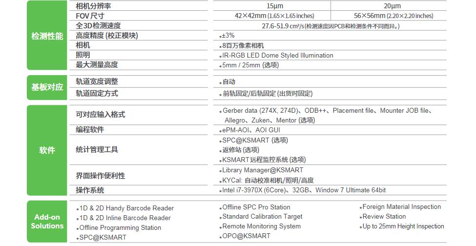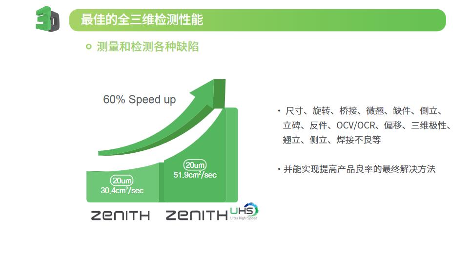 KOH YOUNG TECHNOLOGY Zenith UHS 高速全3D AOI,帶來 SMT 工藝管理的革命 行業(yè)領(lǐng)先的全三維測量檢測設(shè)備技術(shù)解決方案 - 業(yè)界唯一既符合 IPC-610 標準又具備直觀編程的檢測標準設(shè)置 - 通過基于測量的數(shù)據(jù)執(zhí)行缺陷診斷,并消除可能出現(xiàn)錯誤的原因 - 完美的三維焊點檢測 基于全三維數(shù)據(jù)的工藝優(yōu)化解決方案:實現(xiàn)工業(yè) 4.0 /智能工廠 適用于各種生產(chǎn)環(huán)境的最佳規(guī)格典范