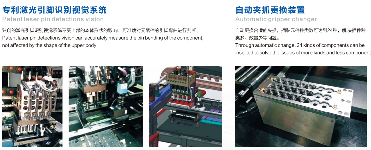 B&P異型元件插件機(jī),自動(dòng)更換合適的夾抓,插裝元件種類可達(dá)到24種,解決插件種類多、數(shù)量少問(wèn)題。