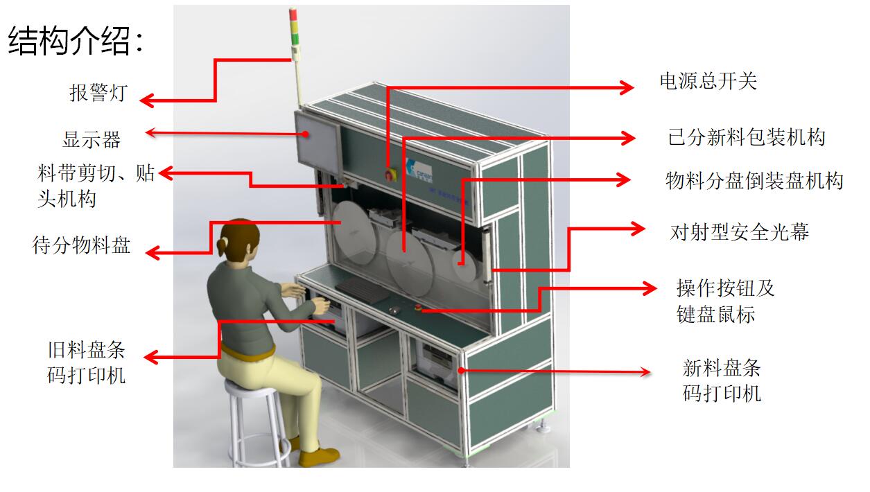 簡介: .通過料盤掃碼自動連接 MES 系統(tǒng),核對并確定分料數(shù)量 .自動精確計數(shù)分盤 ,實現(xiàn)大盤料分小盤料,整數(shù)盤分定數(shù)盤 .自動包裝,減少人員依賴程度,減輕企業(yè)用工負(fù)擔(dān)。 .自動生成新條形碼打印張貼,便于識別與追溯,提高管理效率